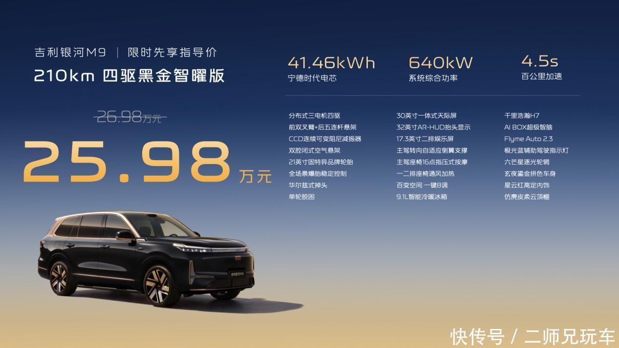 吉利银河M9黑金智曜版限时先享价为25.98万元,为回馈用户长久支持和信赖,吉利银河同步推出重磅上市权益政策:即日起至5月31日,购车可享5000元超级购置税补贴以及5000元限时保险;更可获赠27扬Flyme Sound 无界之声音响、终身免费 NOA 辅助驾驶服务、至高10000元置换补贴等至高价值78000元专属权益。